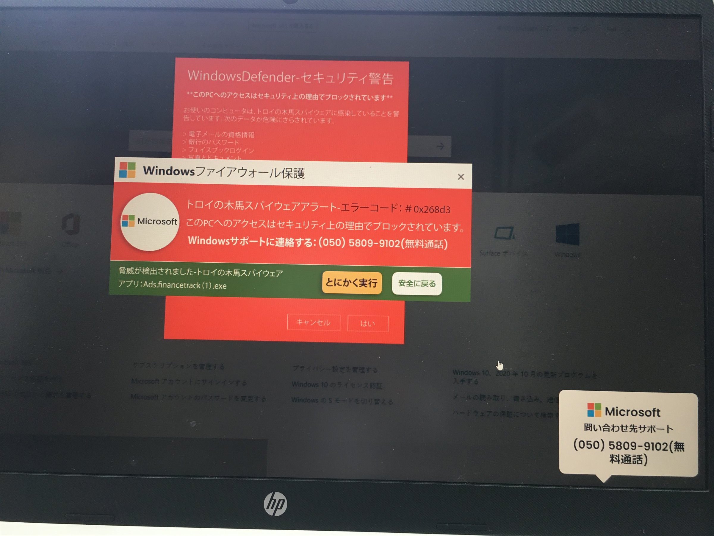 調べてみると、詐欺サイトで表示の電話番号に電話するとパソコンを遠隔操作をしてお金を請求されるようです。